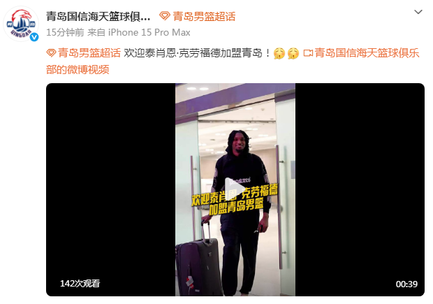 泰肖恩-克劳福德已经抵达,并且表示:“这是我第二次来中国,很感恩能获得这个机会,期待从每个人身上学习、让自己变得更好,迫不及待开始工作。”