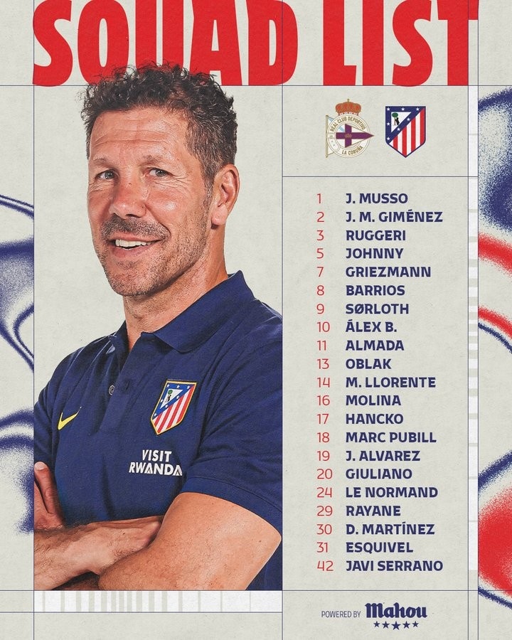 马竞客战拉科鲁尼亚大名单: